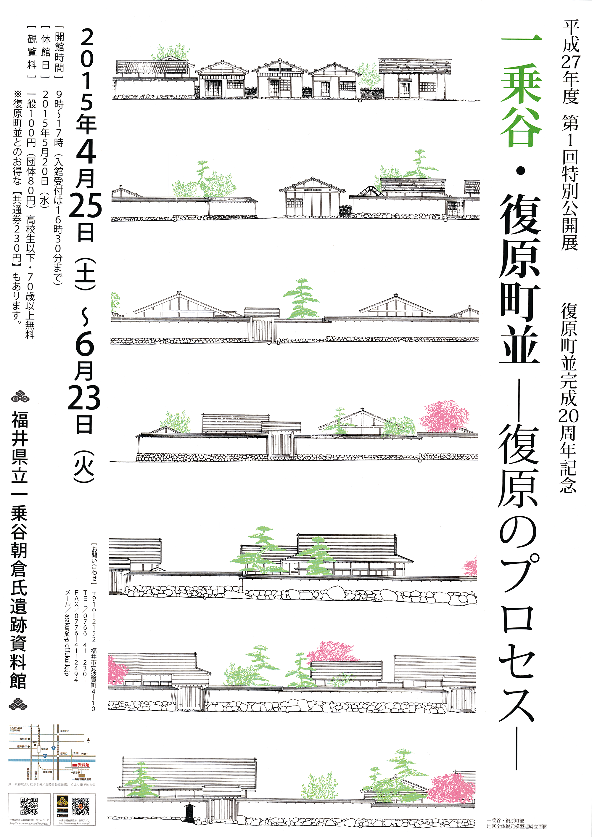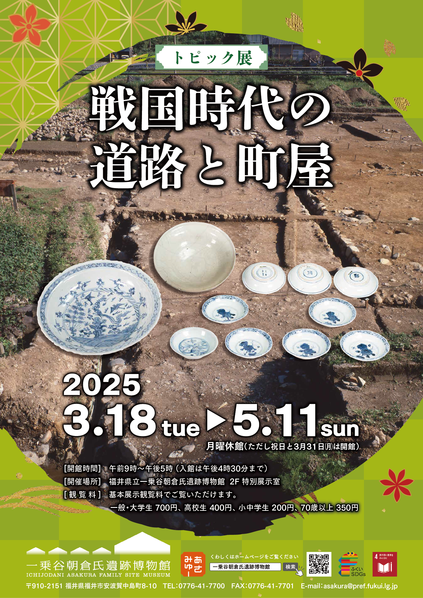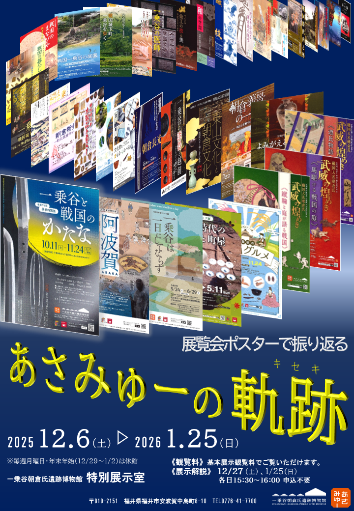 資料館時代からの一乗谷朝倉氏遺跡博物館の軌跡をポスターで振り返るはじめての展覧会です。あさみゅーが開館してから3年が経ち、前身の資料館(1981年)から数えると、令和8年(2026)は 45年目に入ります。今回は朝倉氏遺跡といっしょに成長してきた博物館の道程を、 展覧会ポスターを通してたどります。